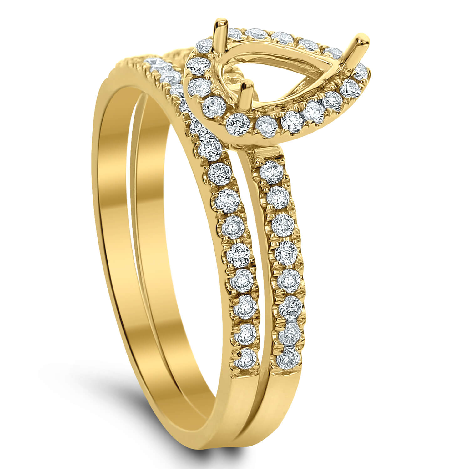 The shank of this superb ring displays into diamond encrusted row of 18kt Gold totaling 0.38 ctw. that lead to pear shaped diamonds that guard a center prong mounting in this stunning diamond engagement ring. Get the gorgeous 0.38 CT Diamond Semi Mount Pear Shape Ring Set for your purpose.