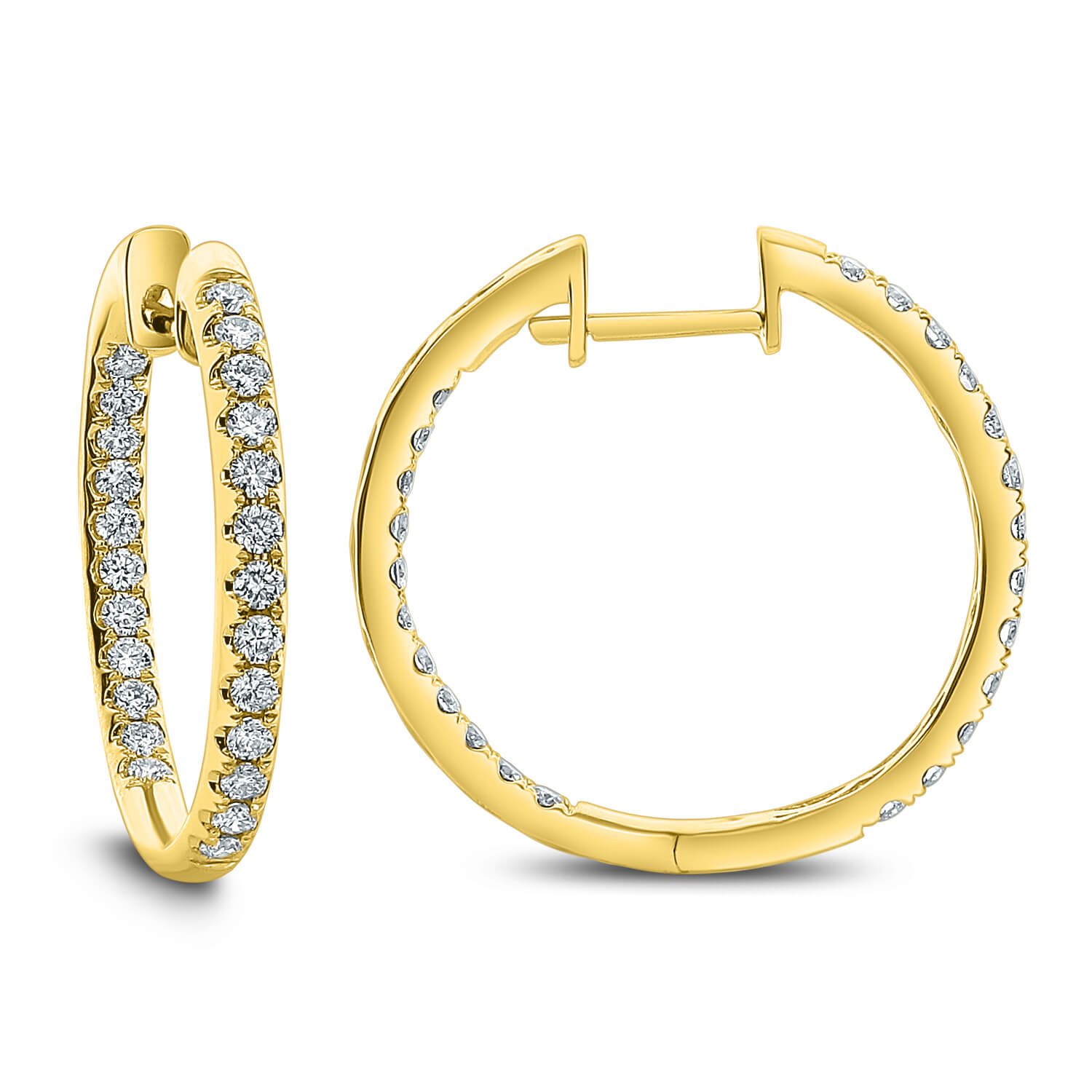 Our diamond round inside outside hoop earrings demonstrate diverse stunning diamonds which allowing the hoops to twinkle from front to back with chic and fine-tuning. Bring on the bling! Diamond-detailed earring features all the fashionable shapes and styles in gleaming 18KT Gold.