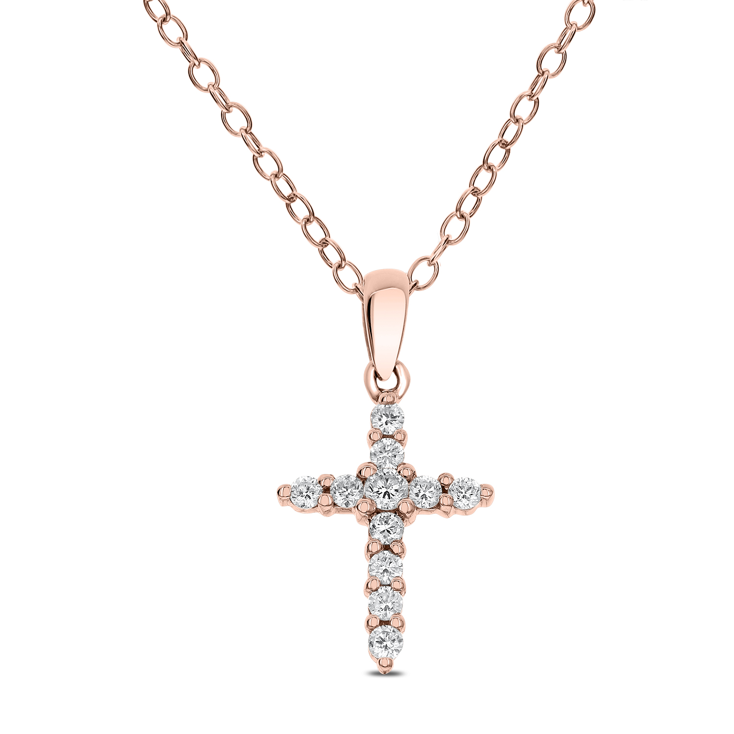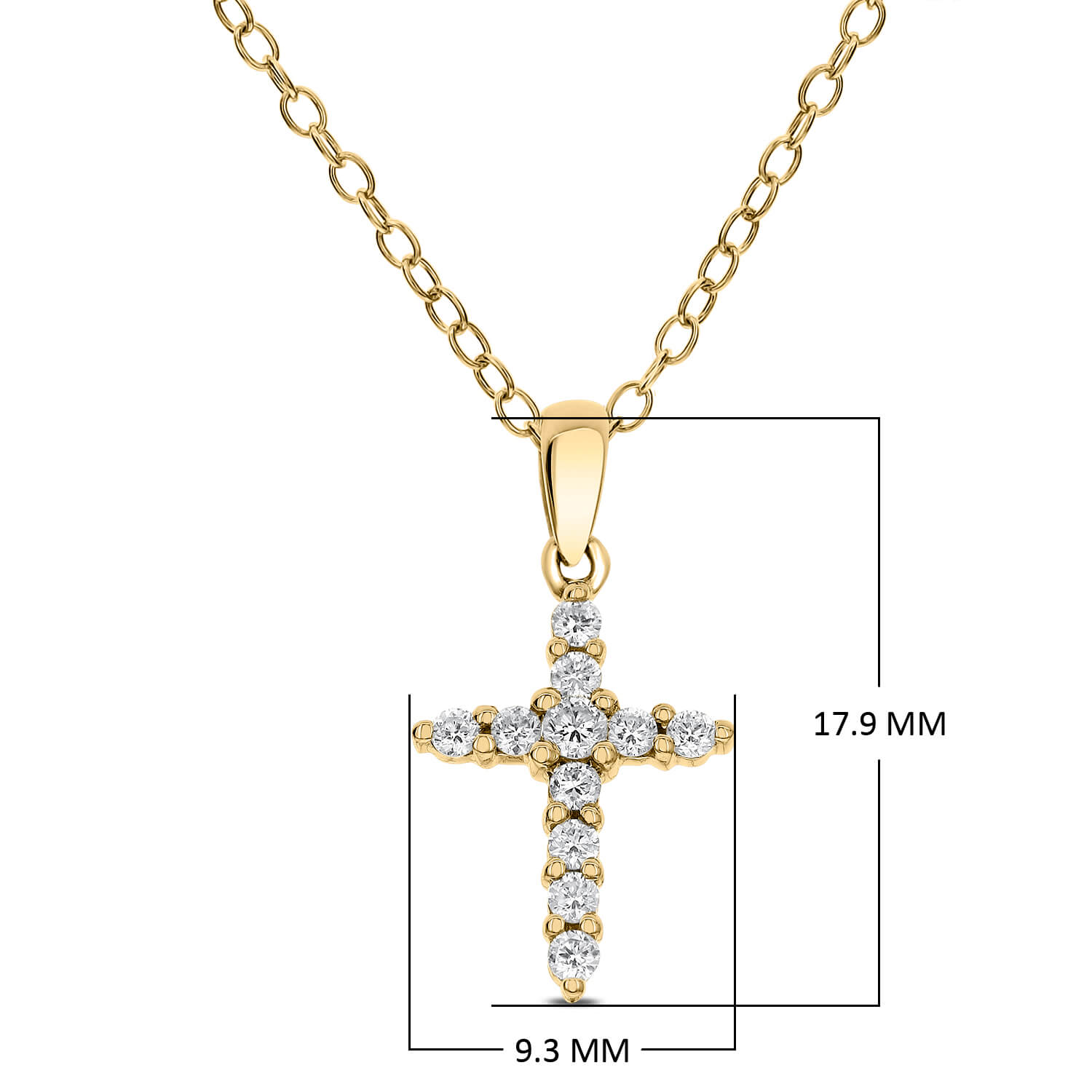 This classic cross pendant features brilliant cut diamonds. All diamonds are prong set in 18k Gold. 0.22 CT Total Diamond weight & Gold clasp lock chain is included for better look.