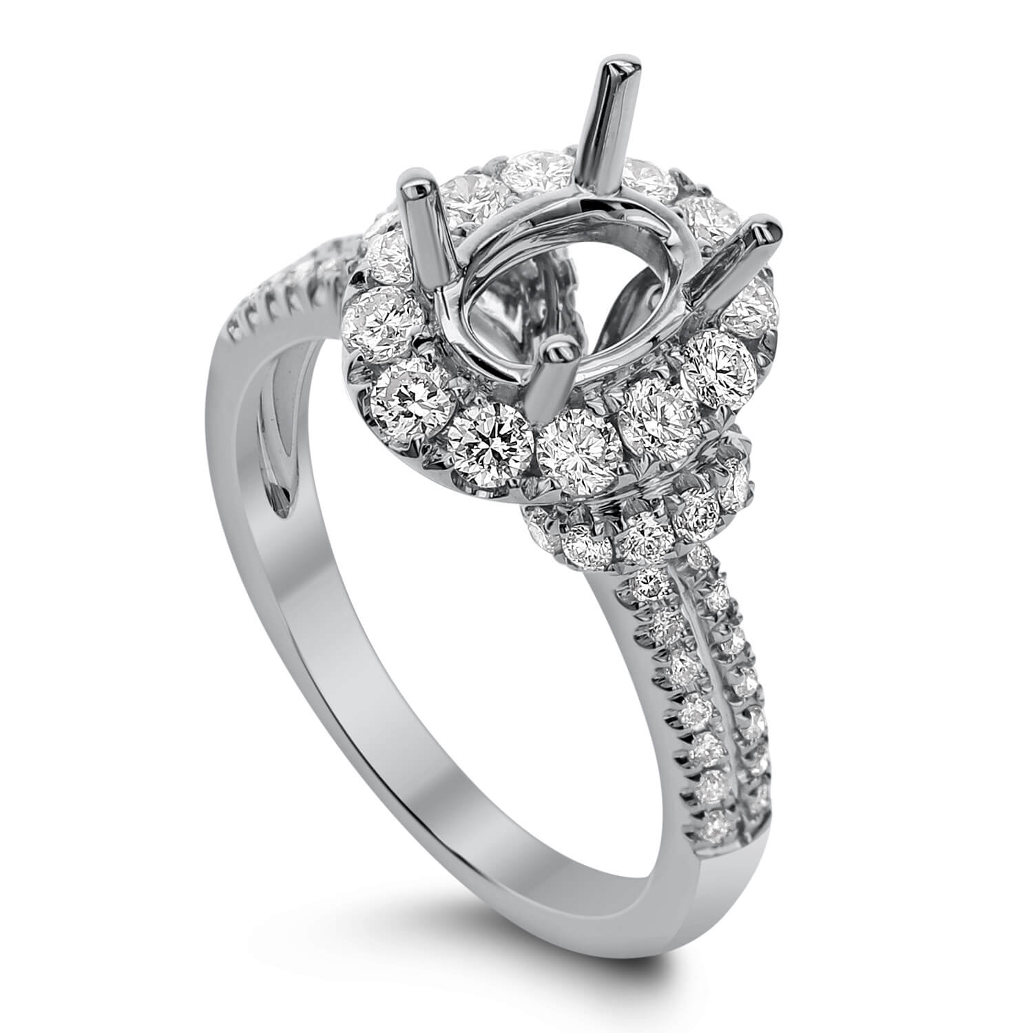 This Diamond Engagement Ring significantly showcases a bizarrely sparkling oval shaped diamond set in the center accentuated with small amazing stones studded in a classic prong setting on each side of the flimsy and gorgeous split style ring shank offering you a flawless appeal. Our 1.68 CT Halo Diamond Semi Mount Oval Ring piece is everyone’s first choice.