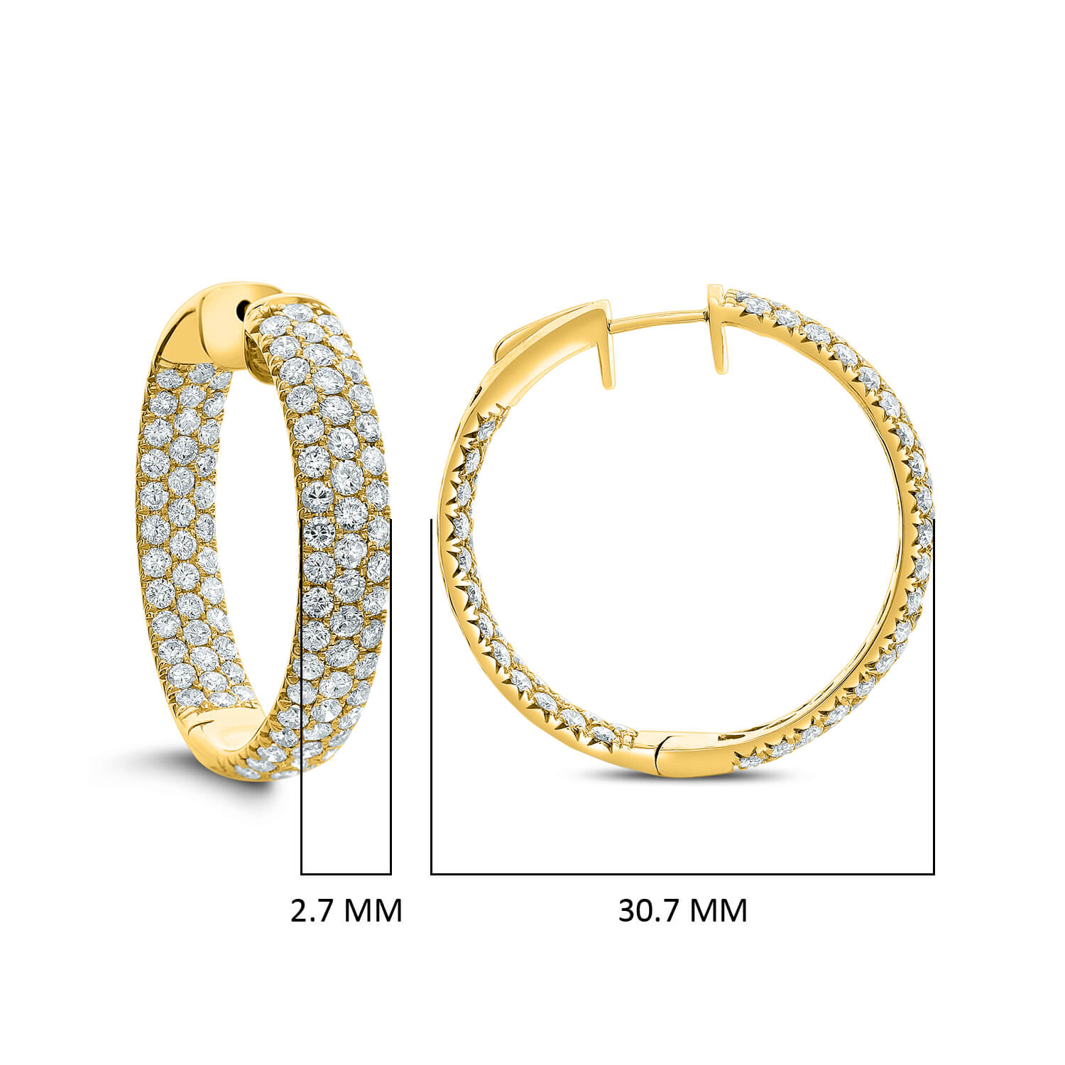 Our gold and diamond statement hoop earring features a unique three-row design forged in Gold. The central design is a three-petal row studded with brilliant cut 5.25 CT Diamonds. In this fascinating three-row hoop earring, a creative interpretation of diamond line sequences is honoured.